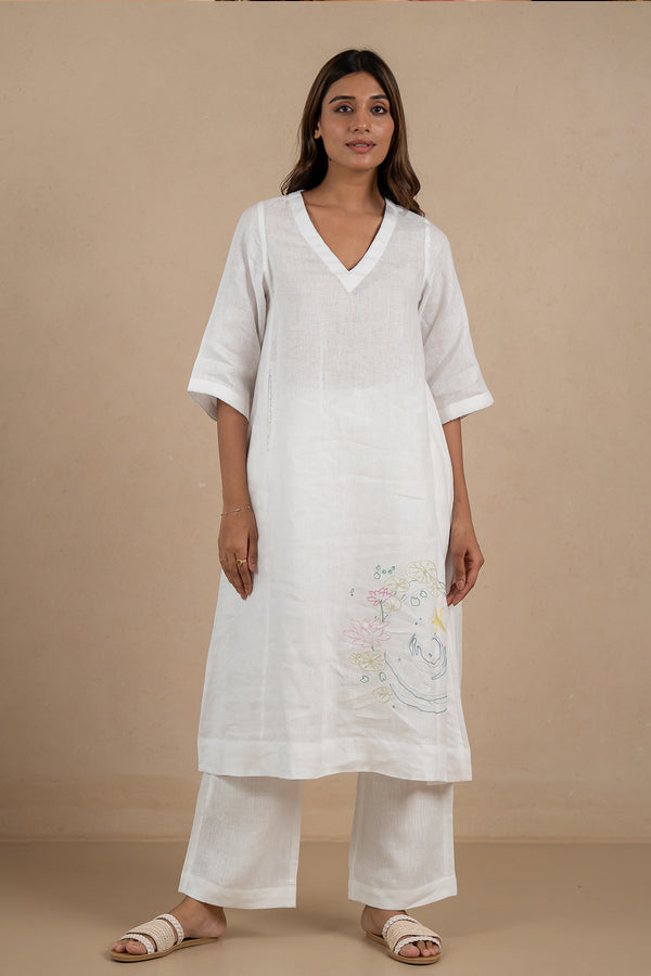 Aqua Linen V-Neck Kurta and Pant set- Marble White
