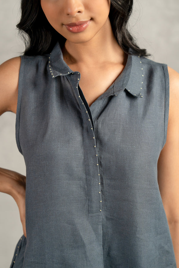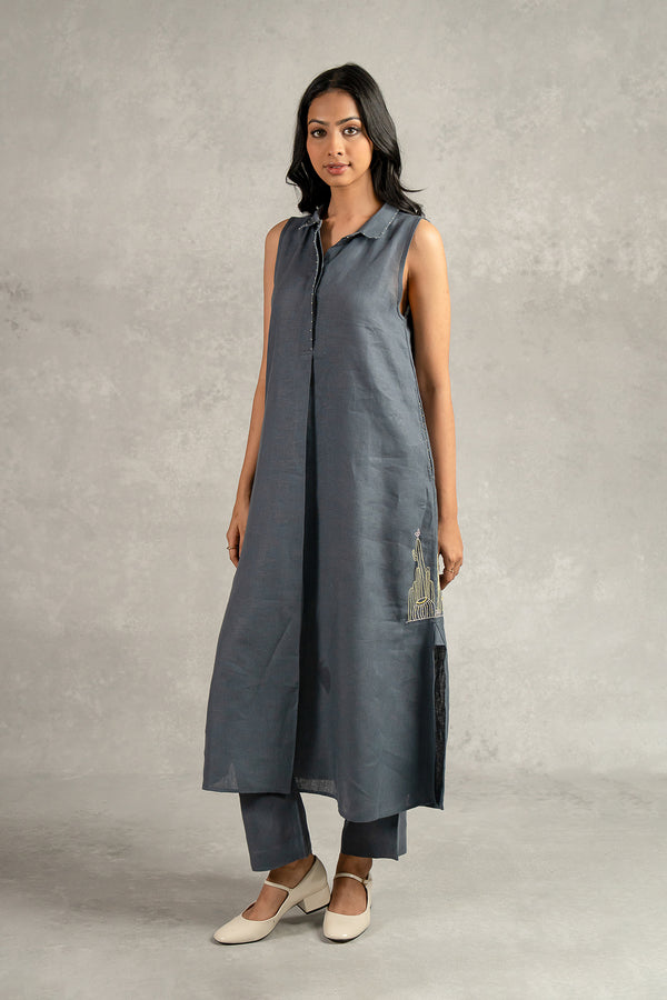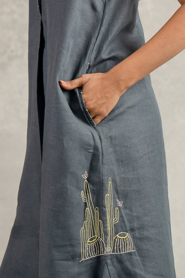 Laura Linen Half Placket Long dress and Pant set with Pockets - Charcoal grey