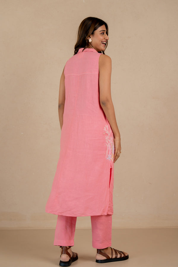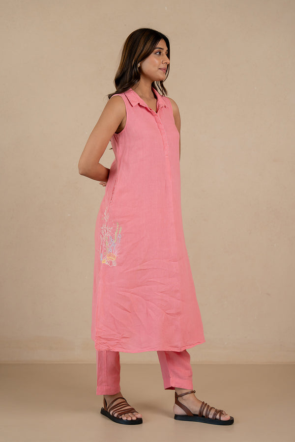 Laura Linen Half Placket Long Dress and Pant Set With Pockets - Flamingo Pink