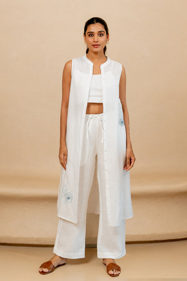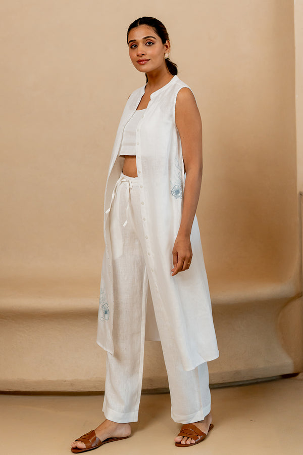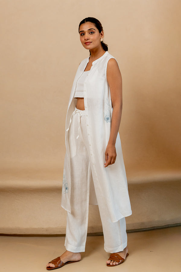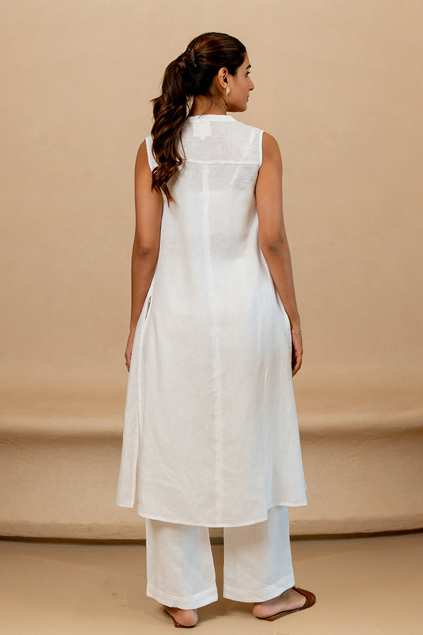 Linen Sleeveless Pearl Kurta and Pant Set- Marble White