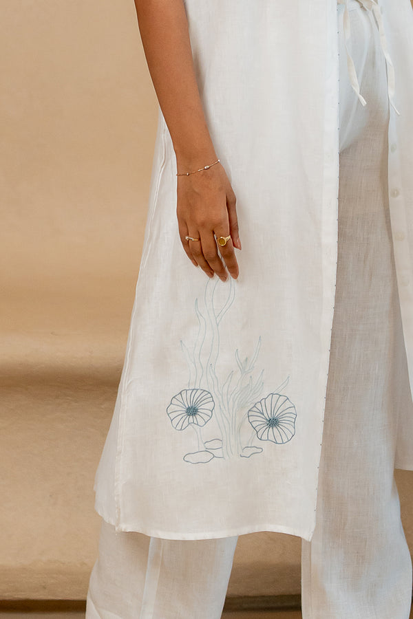 Linen Full Placket Short Kurta & pant Set- Marble White