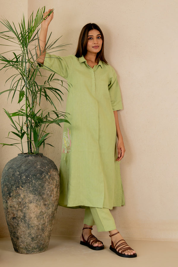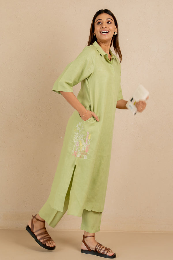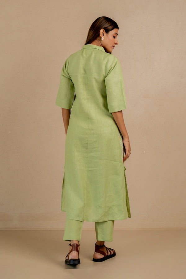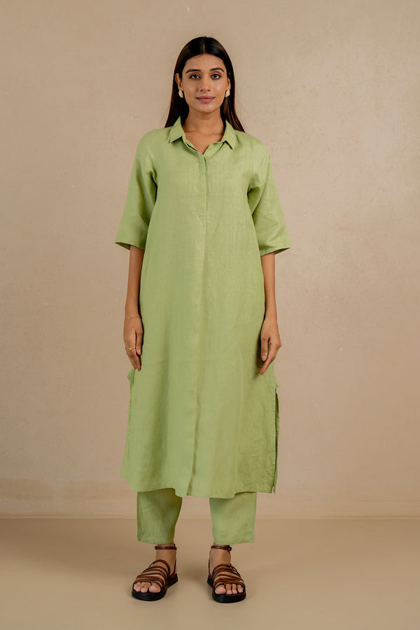 Linen Full Placket Short Kurta & pant set- Algae Green
