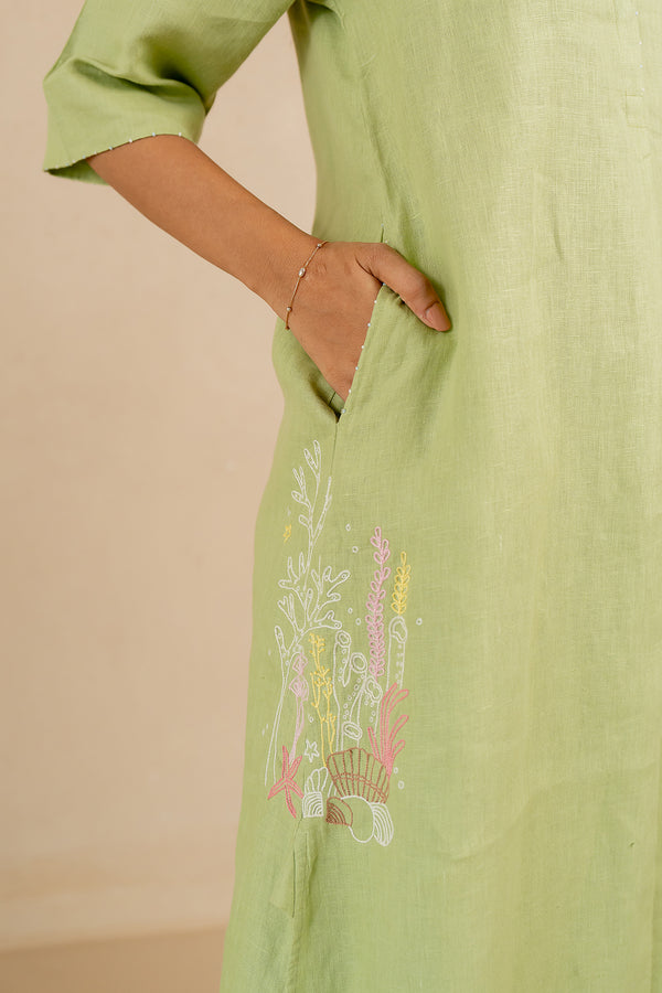 Tania Linen Half Placket Long Dress and Pant Set With Pockets - Algae Green