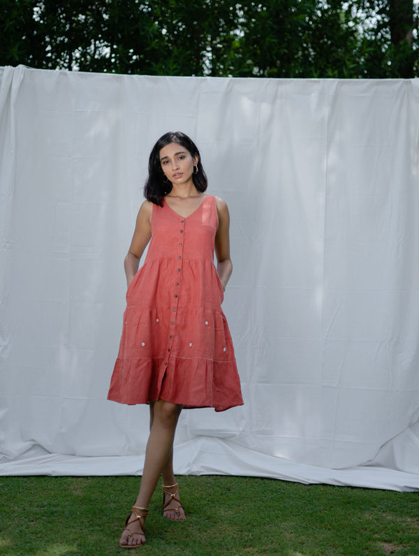 Linen sleeveless tier dress - Rust