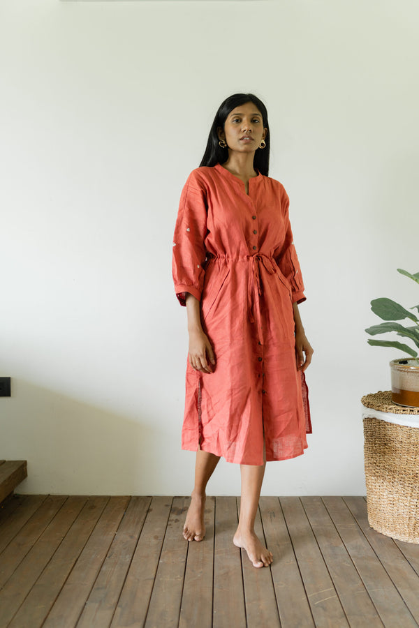 Linen Drawstring Straight Dress - Rust