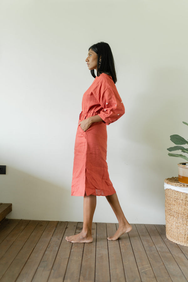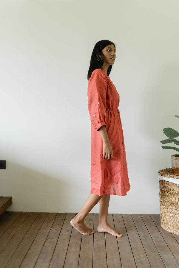 Linen Side Gather Dress - Rust