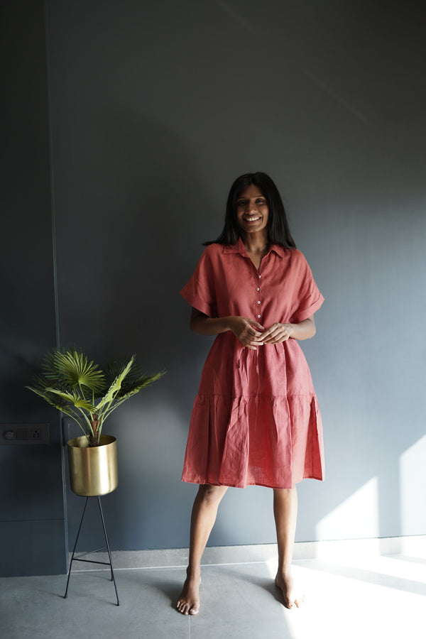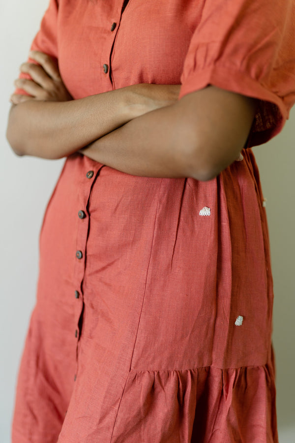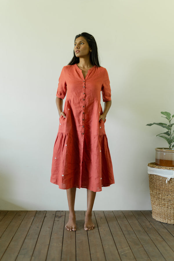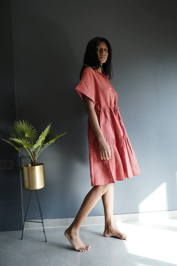 Linen Drawstring Tier Dress - Rust