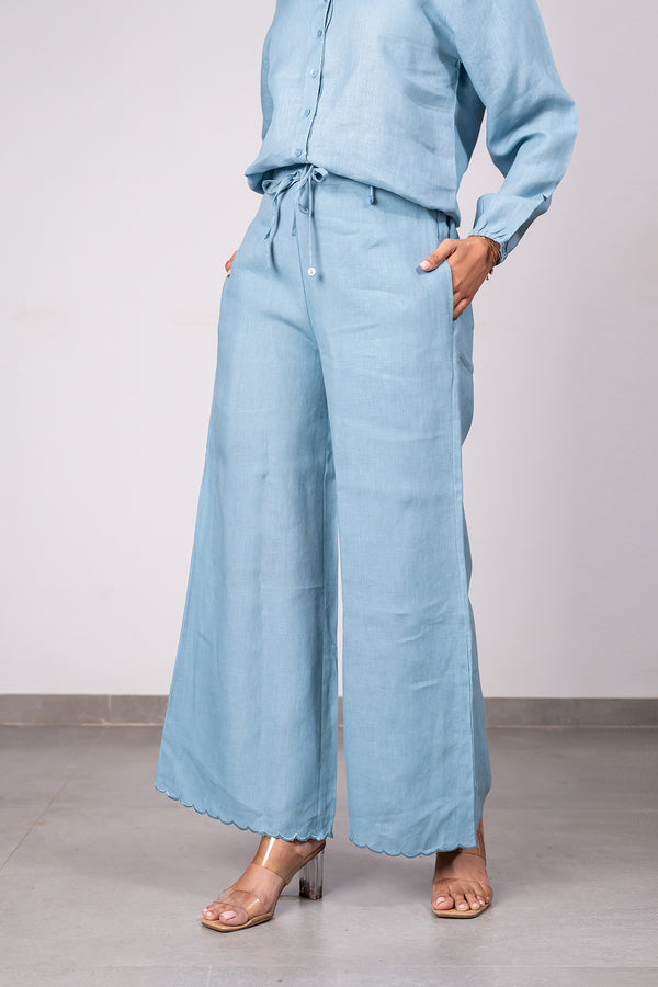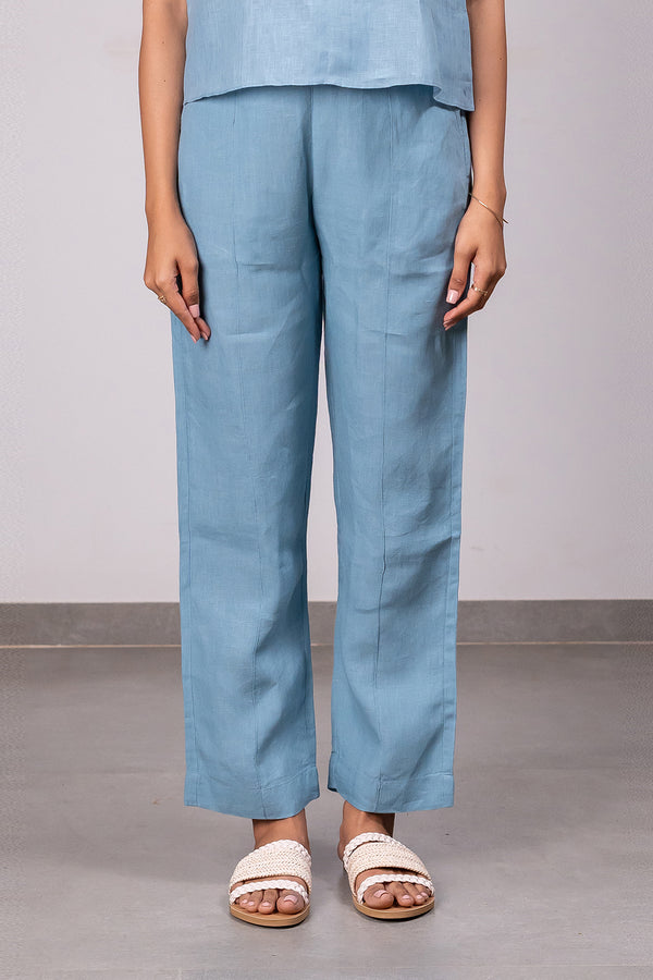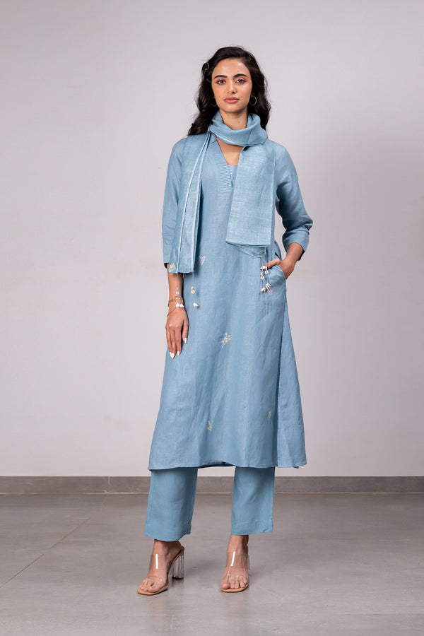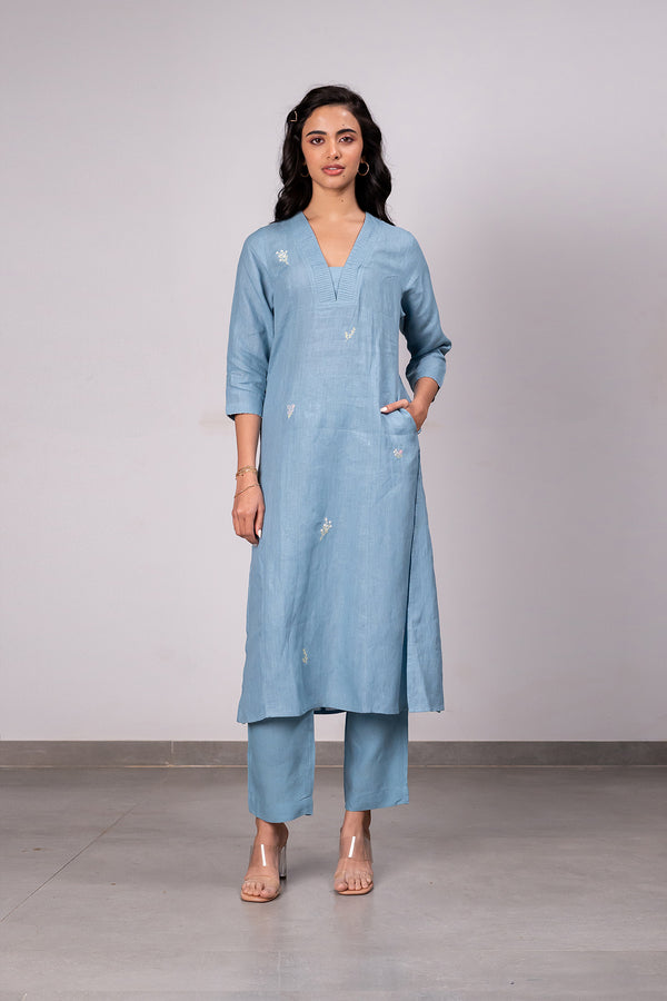 Clara Linen V-Neck Pin Tucks Kurta Pants Set With Pockets - Icy Blue