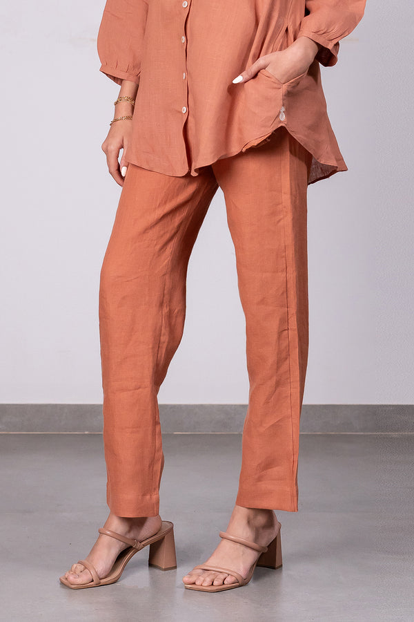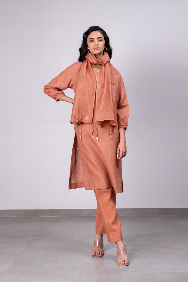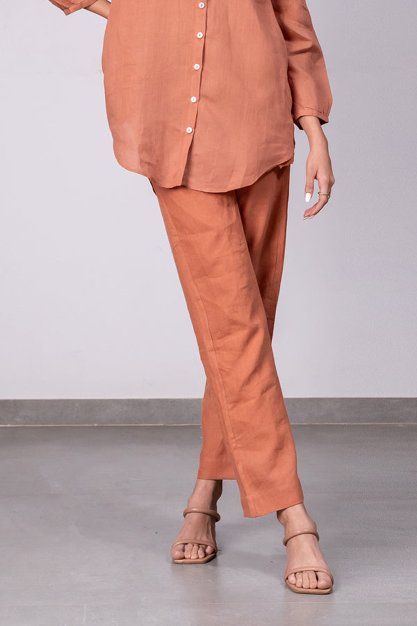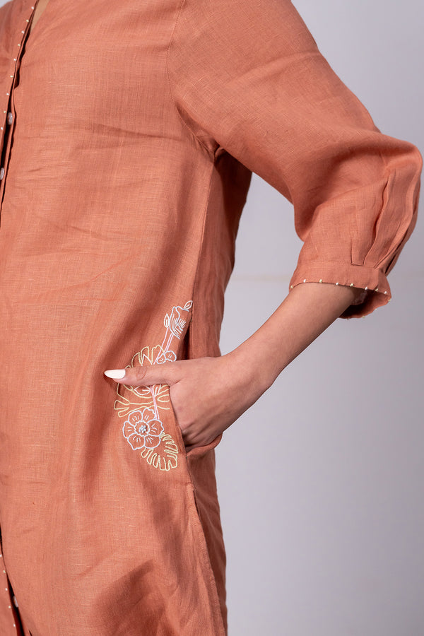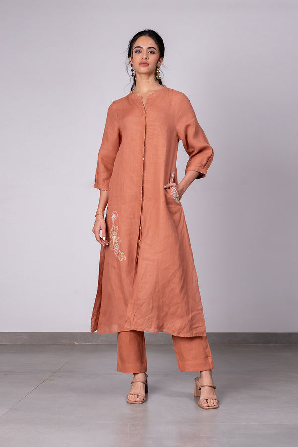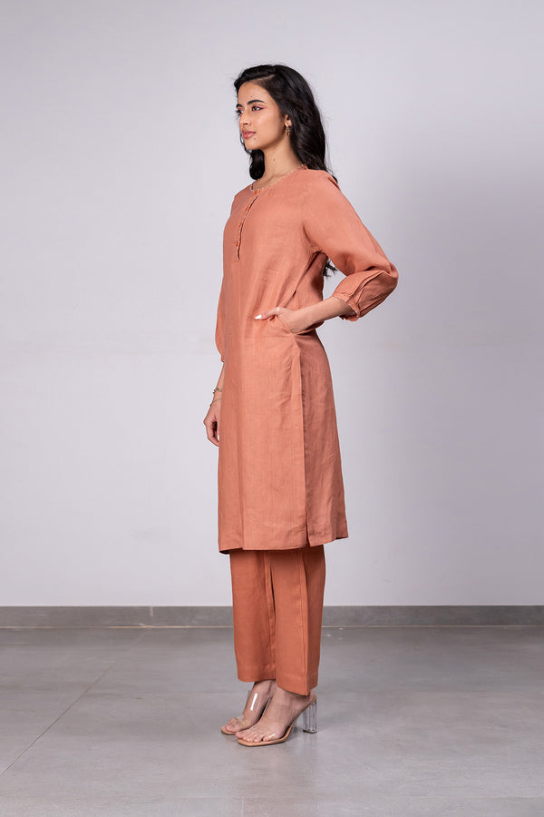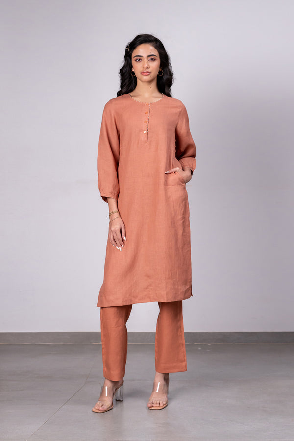 Demi Linen Buttoned Kurta- Pant set with pockets - Sand Brown