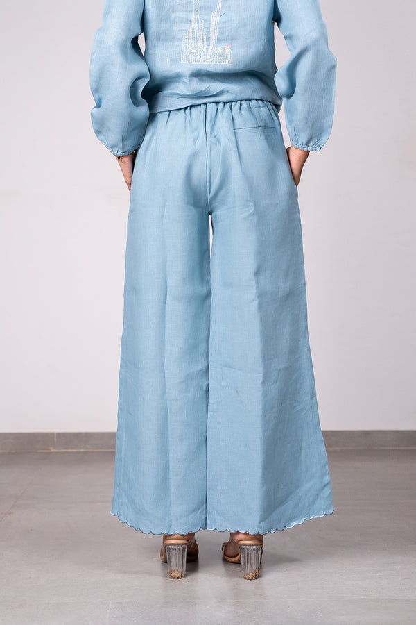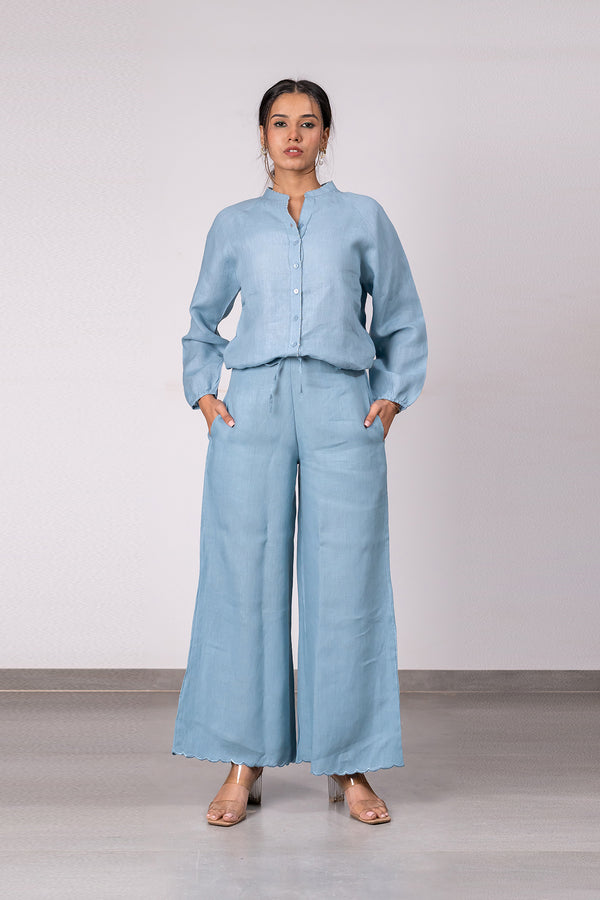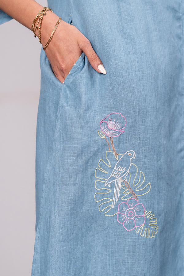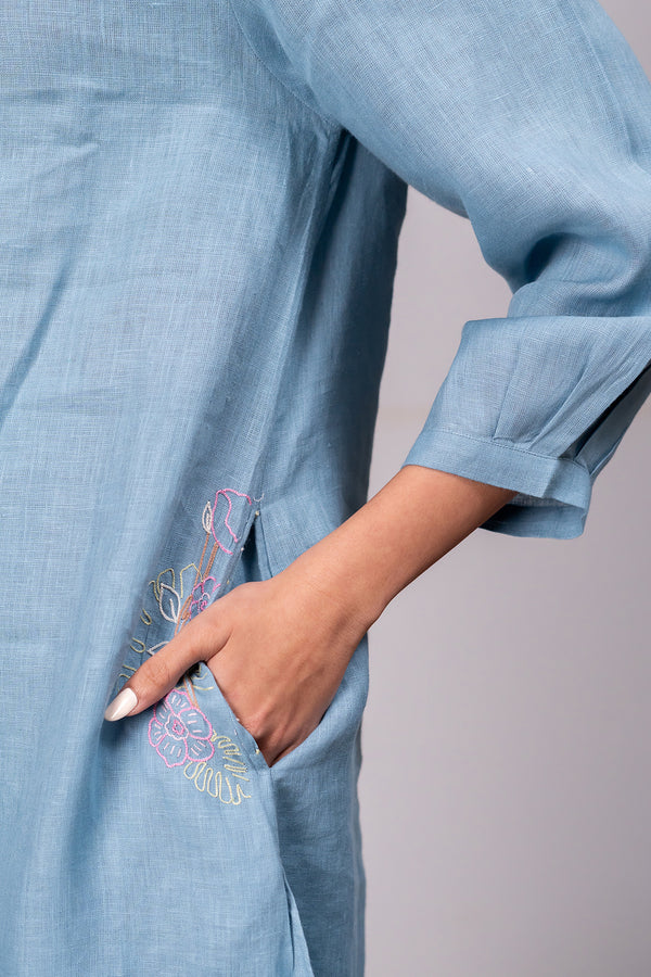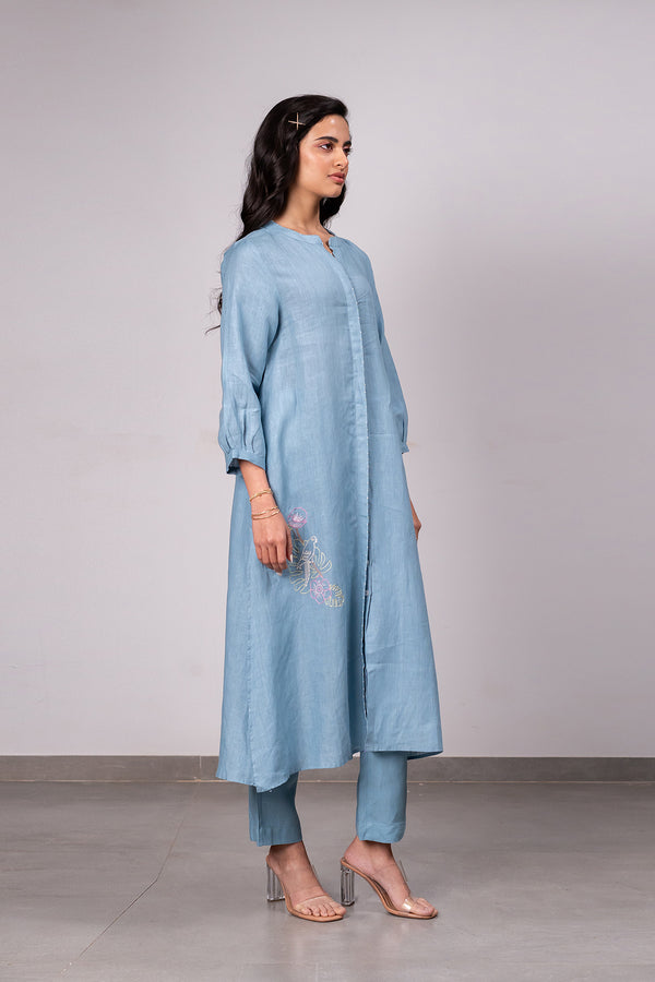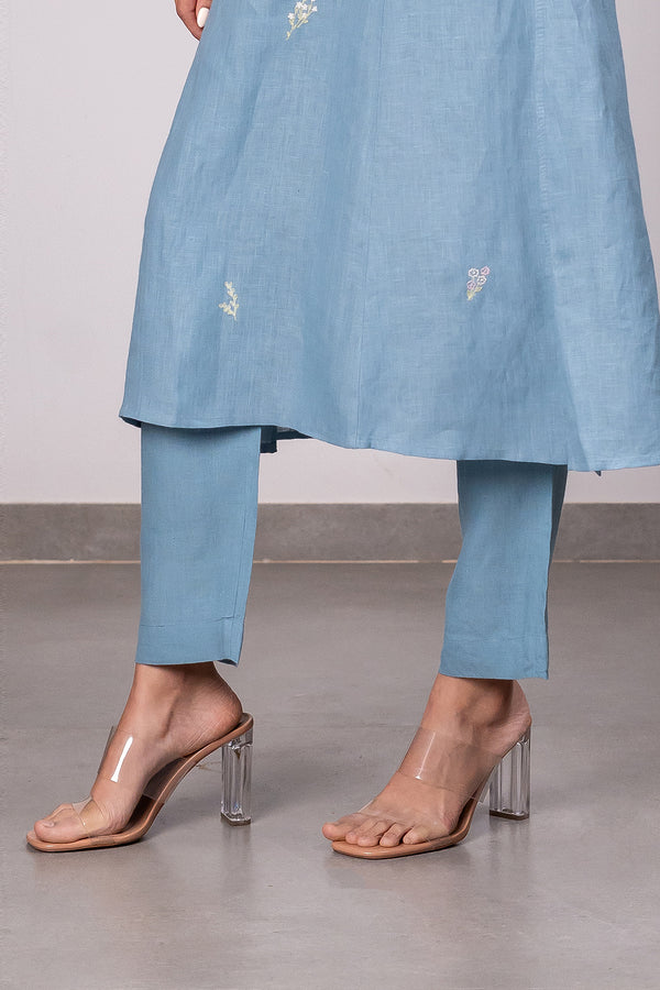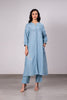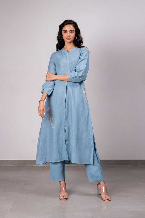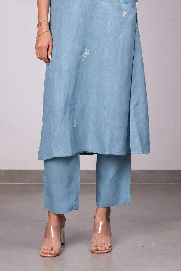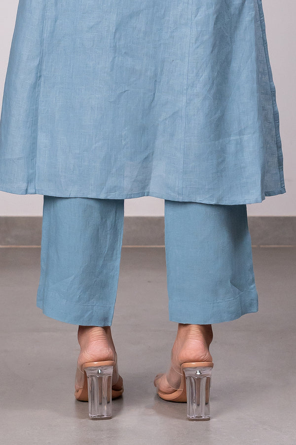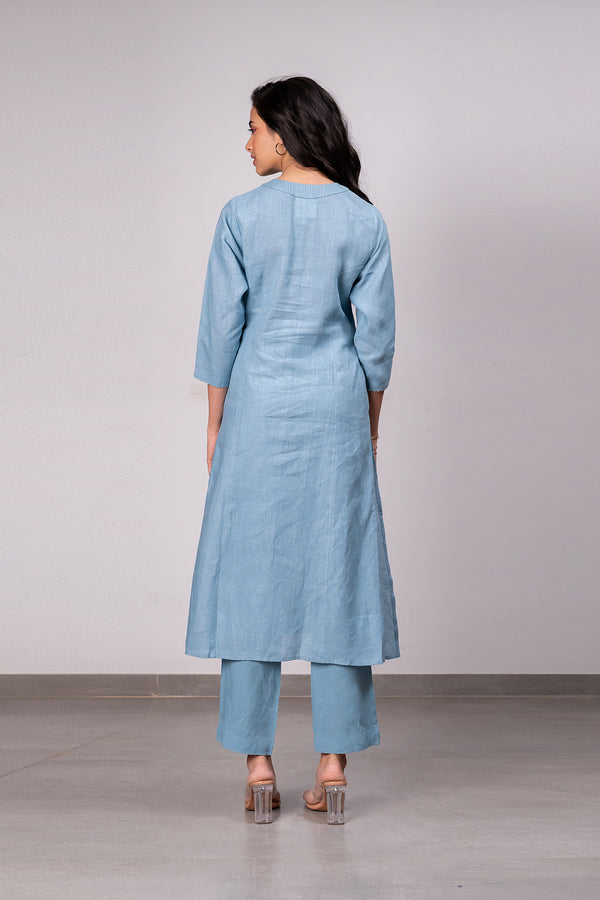 Demi Linen Buttoned Kurta- Pant Set With Pockets - Icy Blue