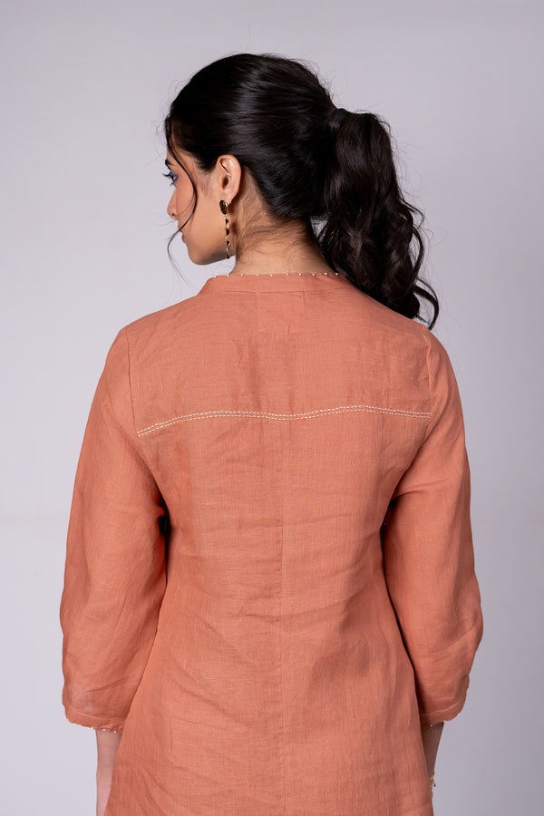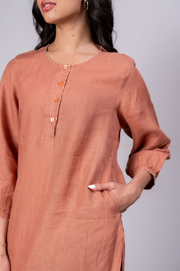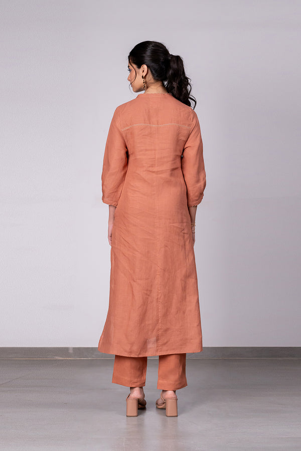 Janice Linen Half Placket Kurta - Pants set with pockets - Sand Brown