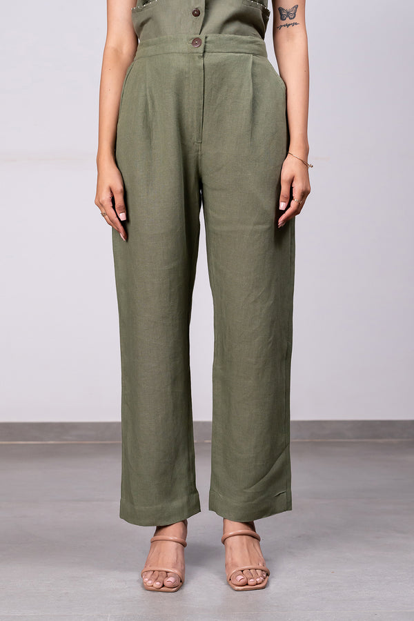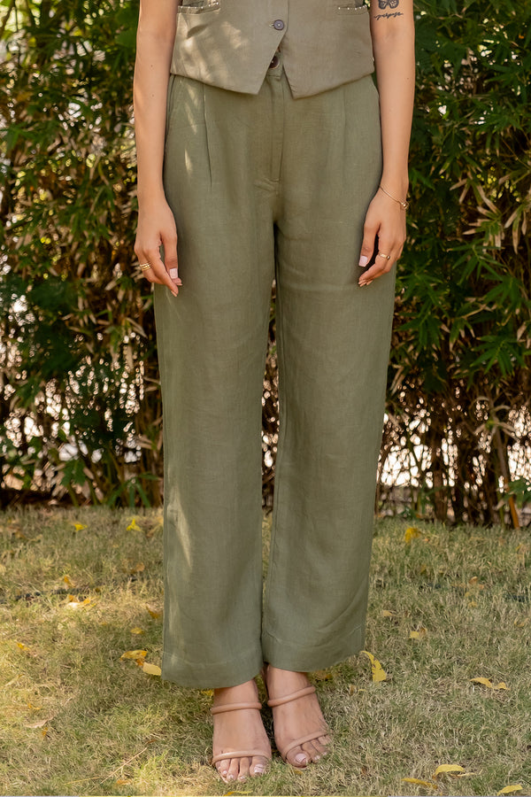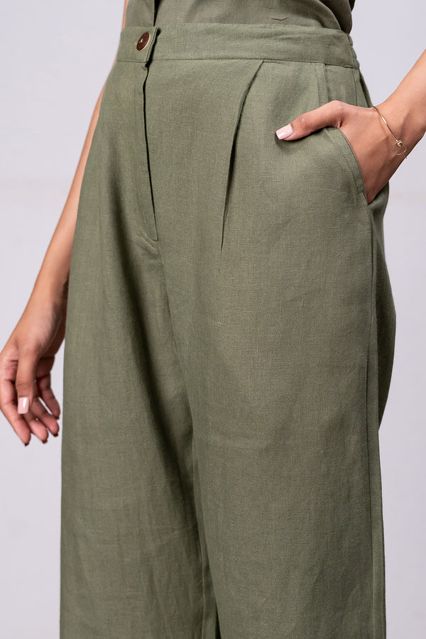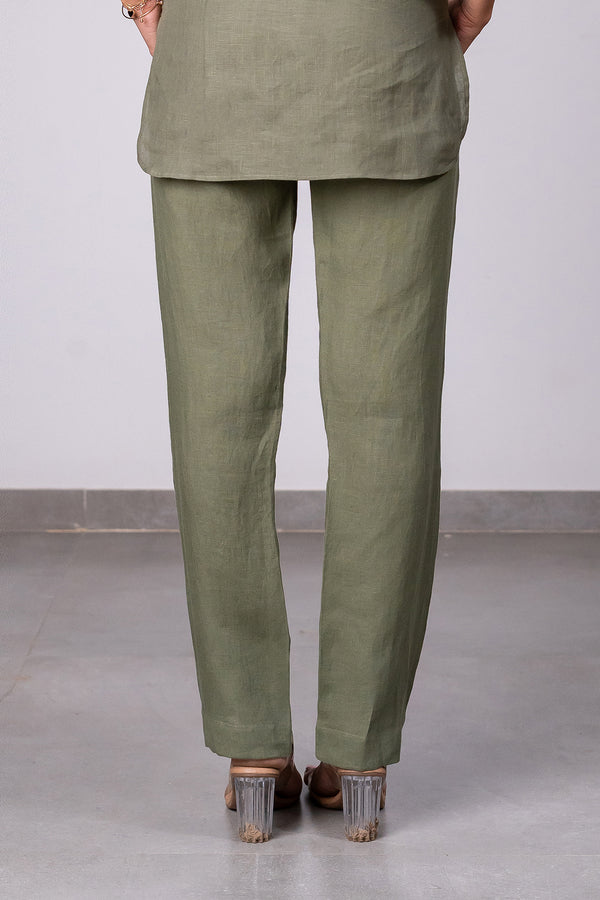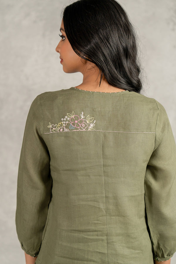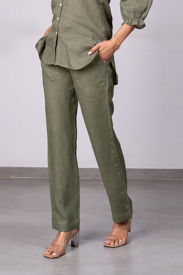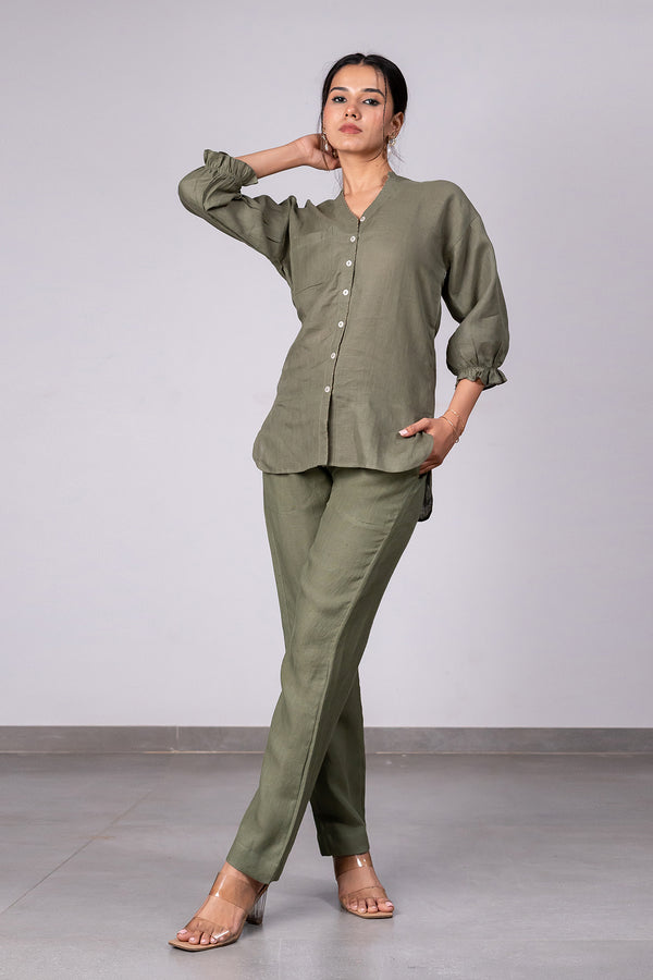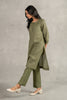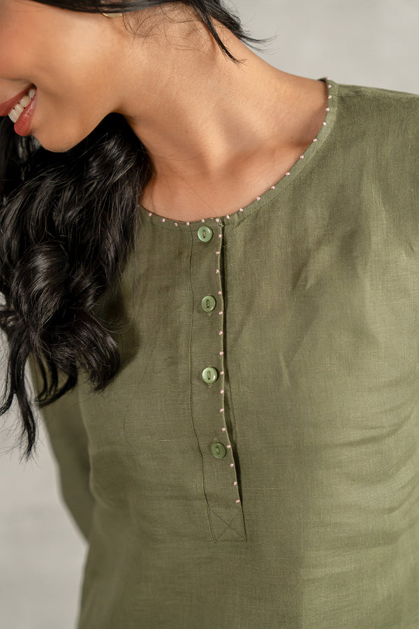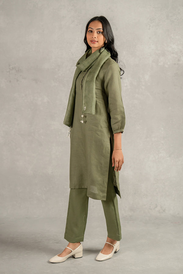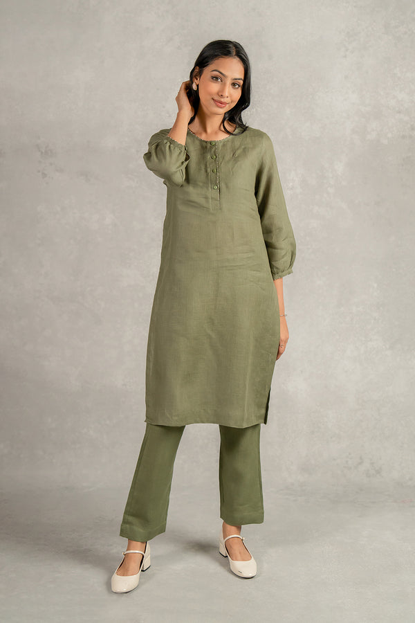 Janice Linen Half Placket Kurta - Pants set with pockets - Olive Green