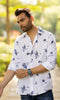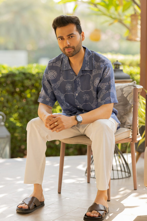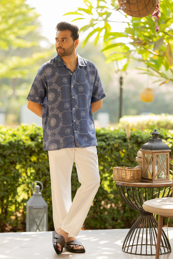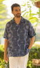 Linen Men Shawl Collar Shirt- Blue Tiger