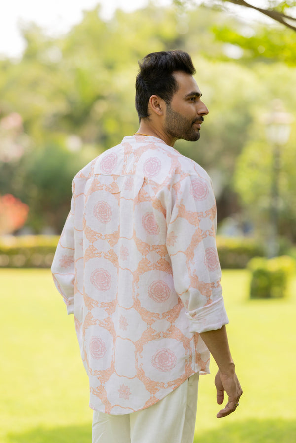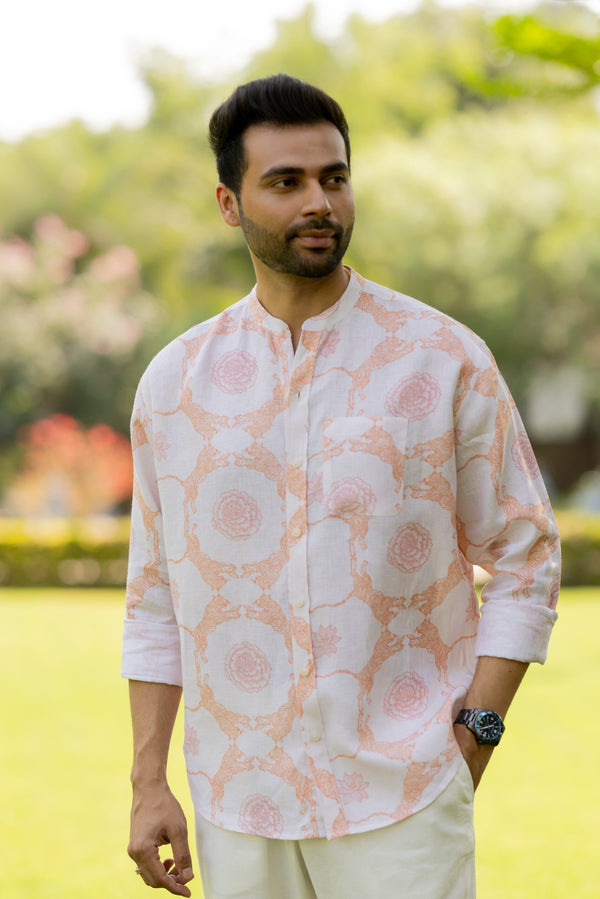 Linen Men Mandarin Collar Shirt - Orange Tiger