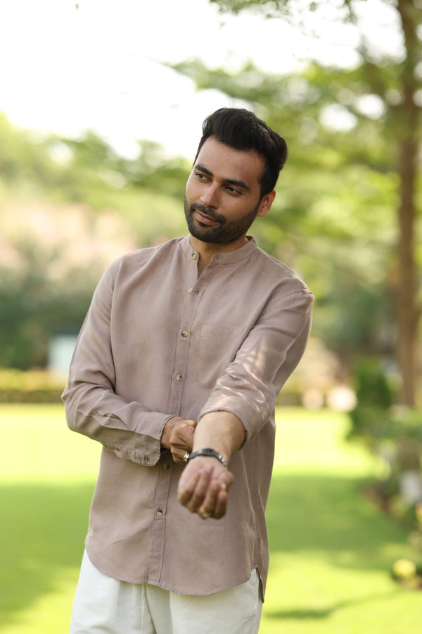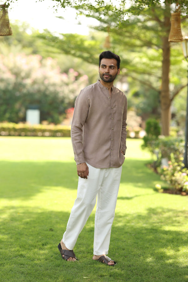 Linen Men Mandarin Collar Shirt - Mud