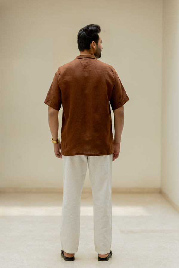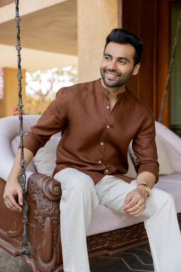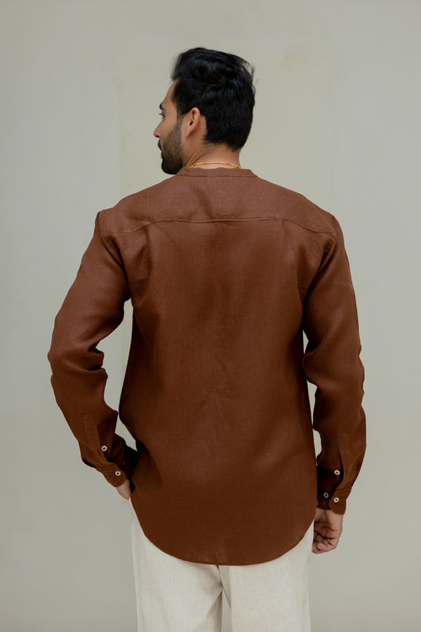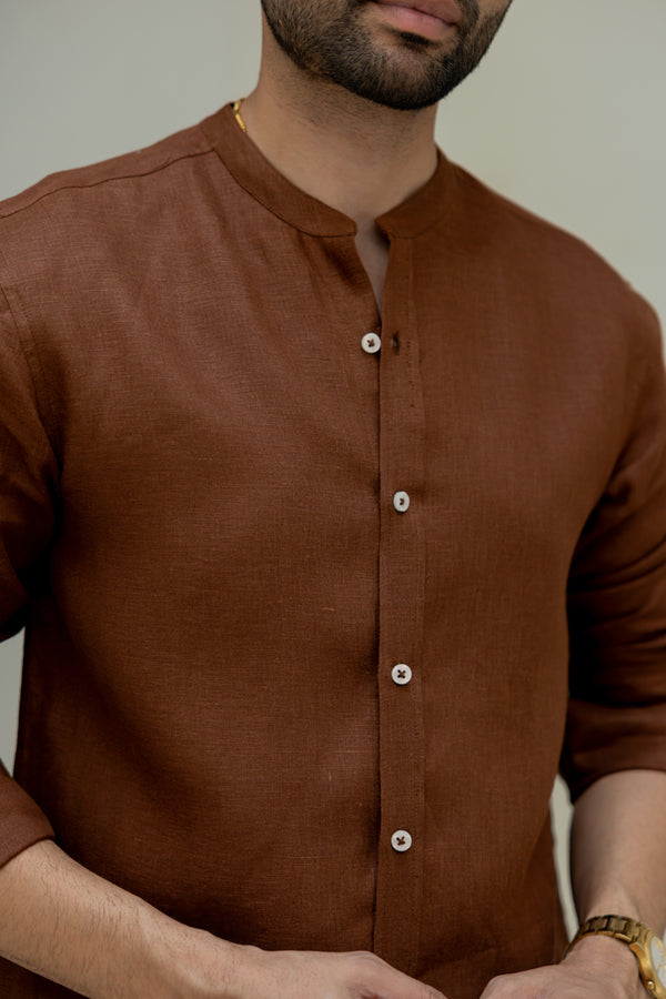 Linen Mandarin Collar Shirt - Chocolate Brown