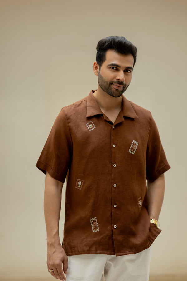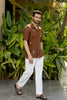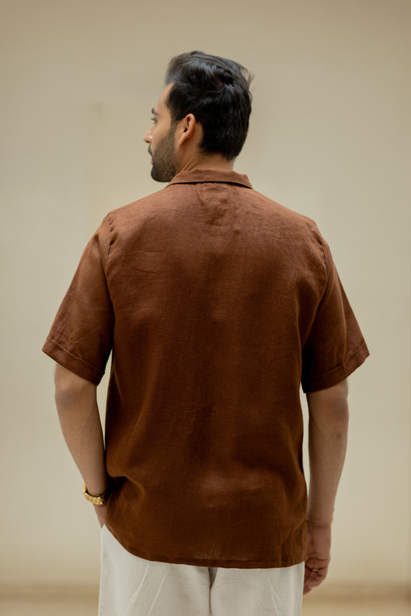 Linen Men Shawl Collar Shirt - Chocolate Brown