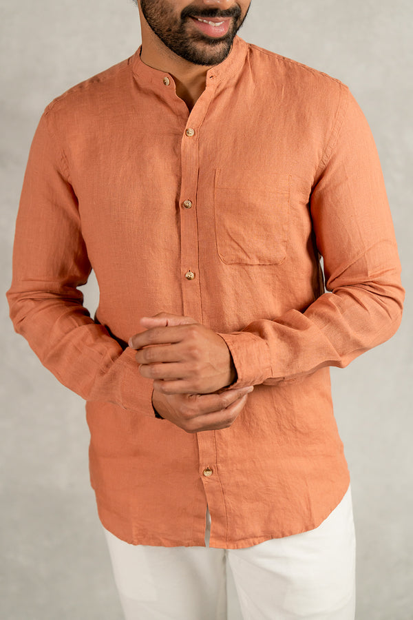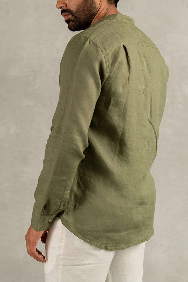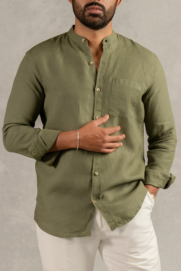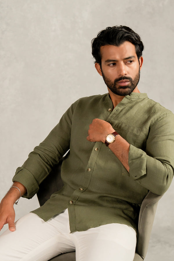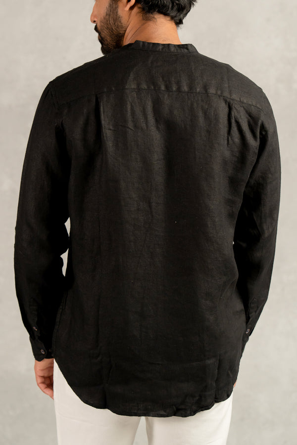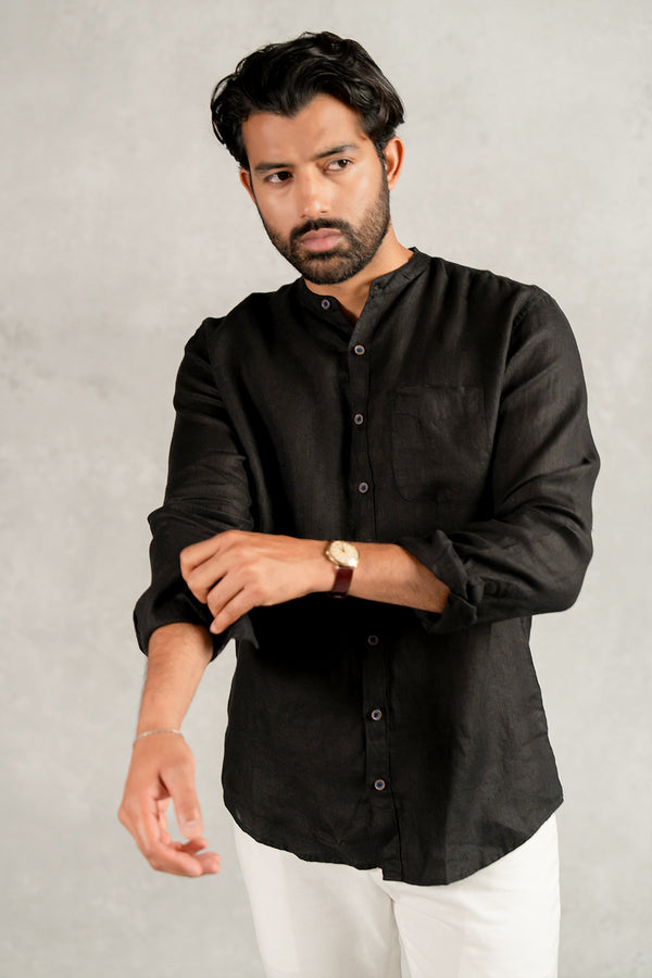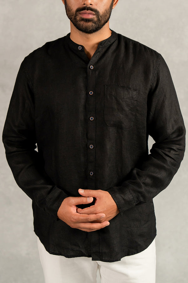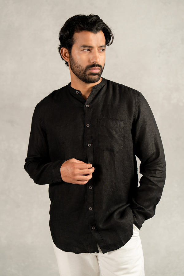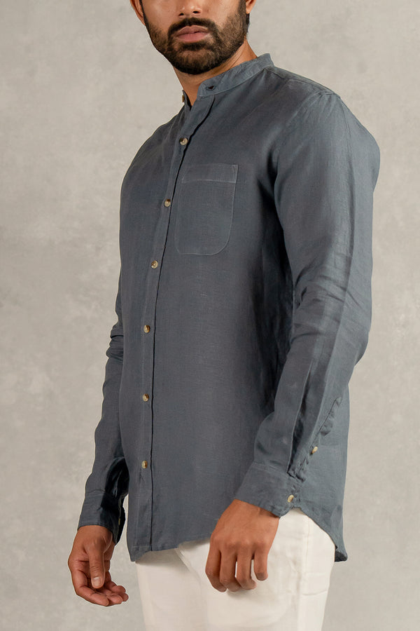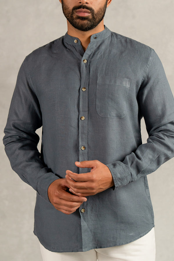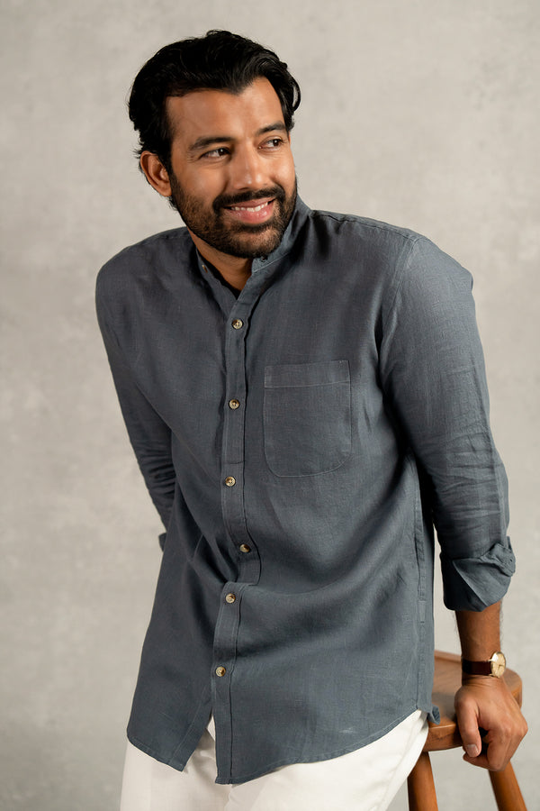 Linen Men Mandarin Collar Shirt - Charcoal Grey