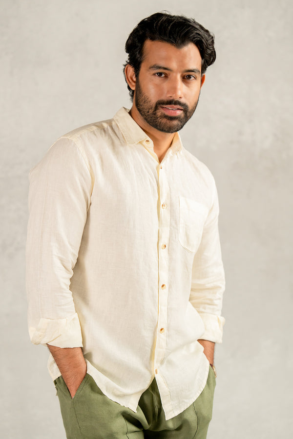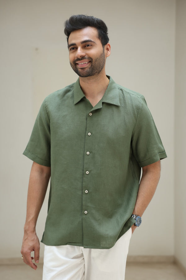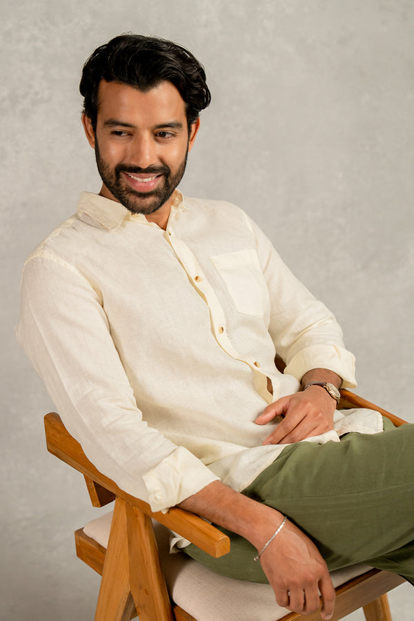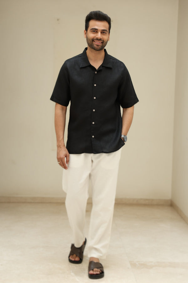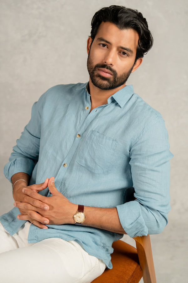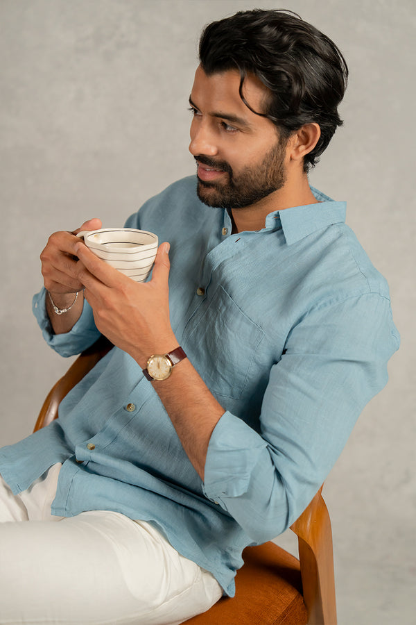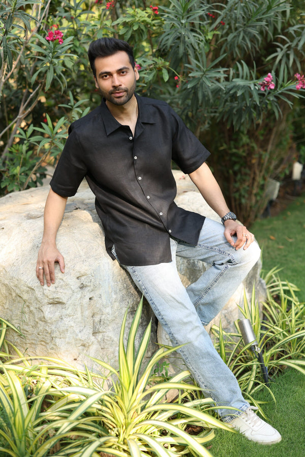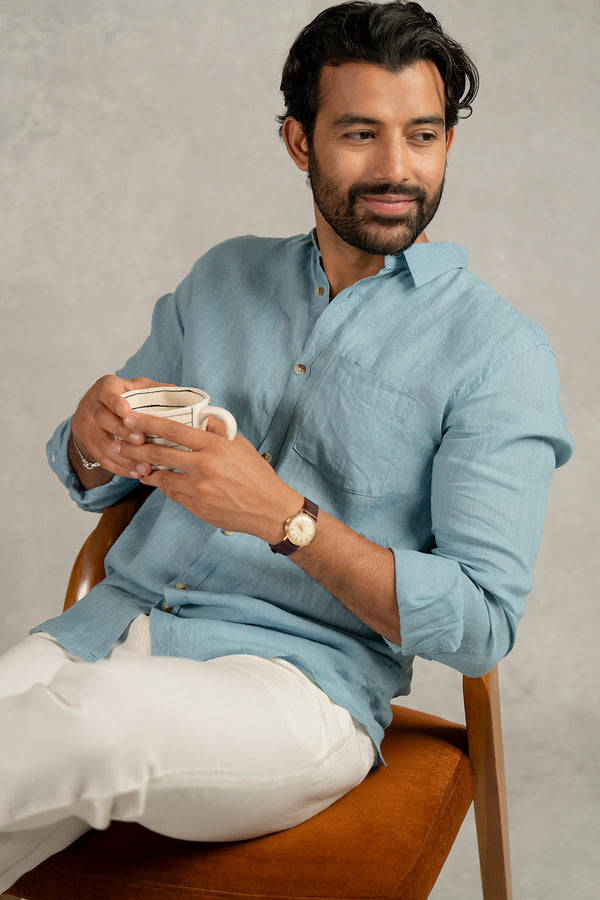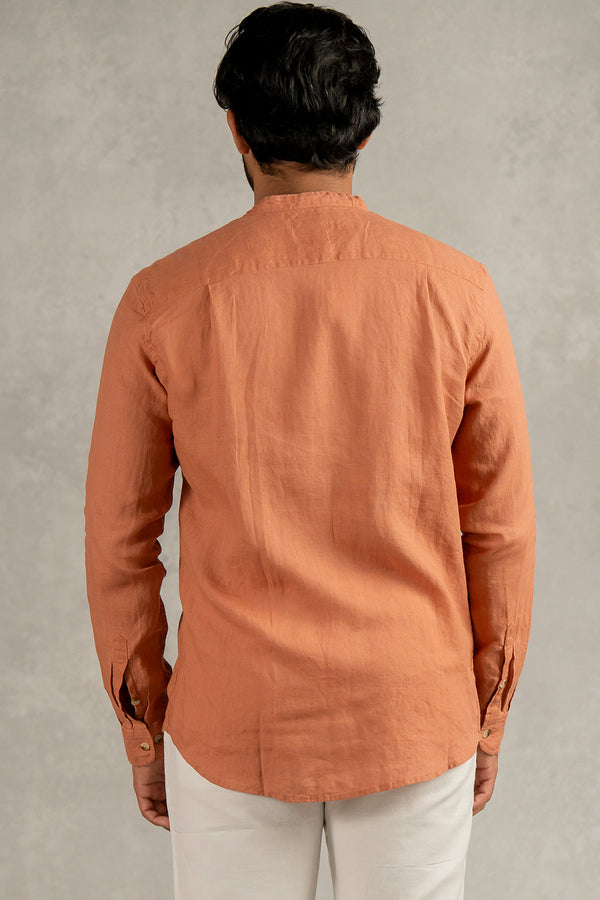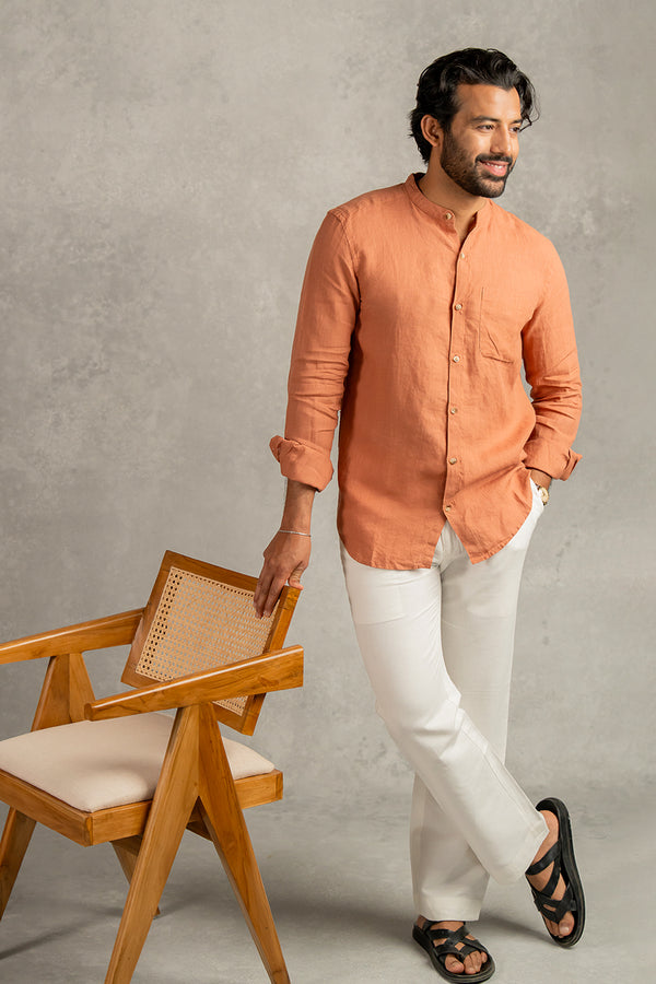 Linen Men Mandarin Collar Shirt - Charcoal Grey