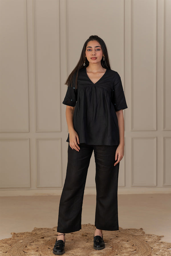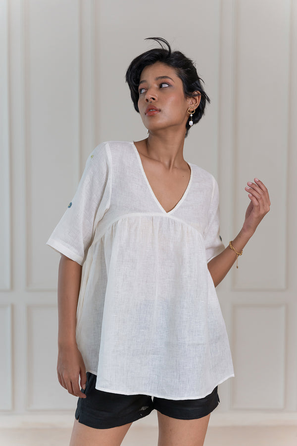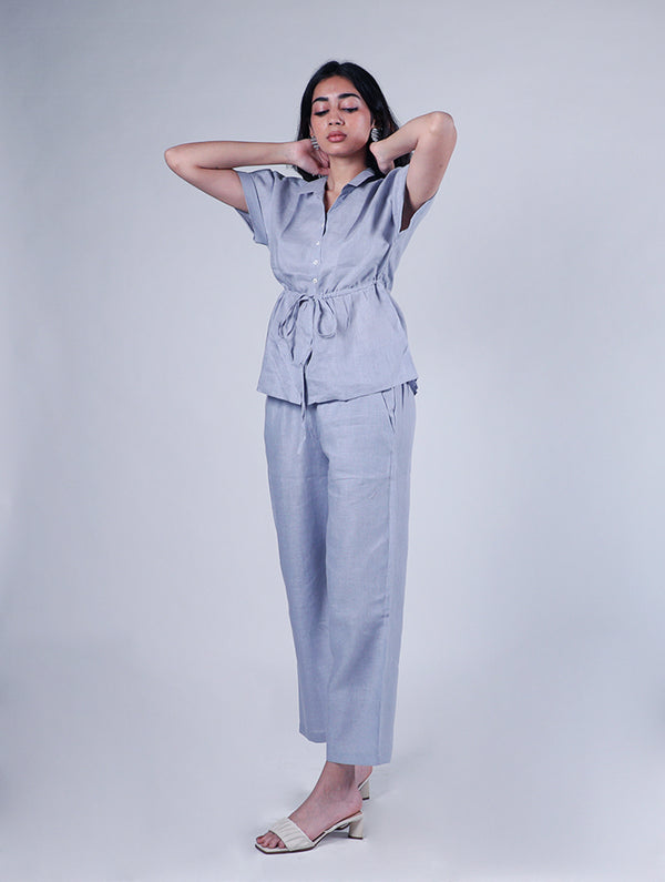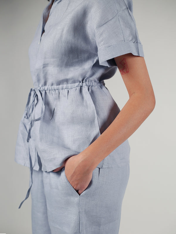 HEATHER LINEN DRAWSTRING TOP - Powder Blue