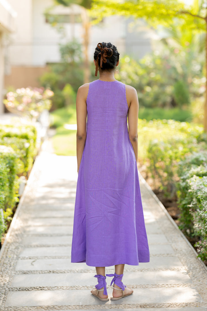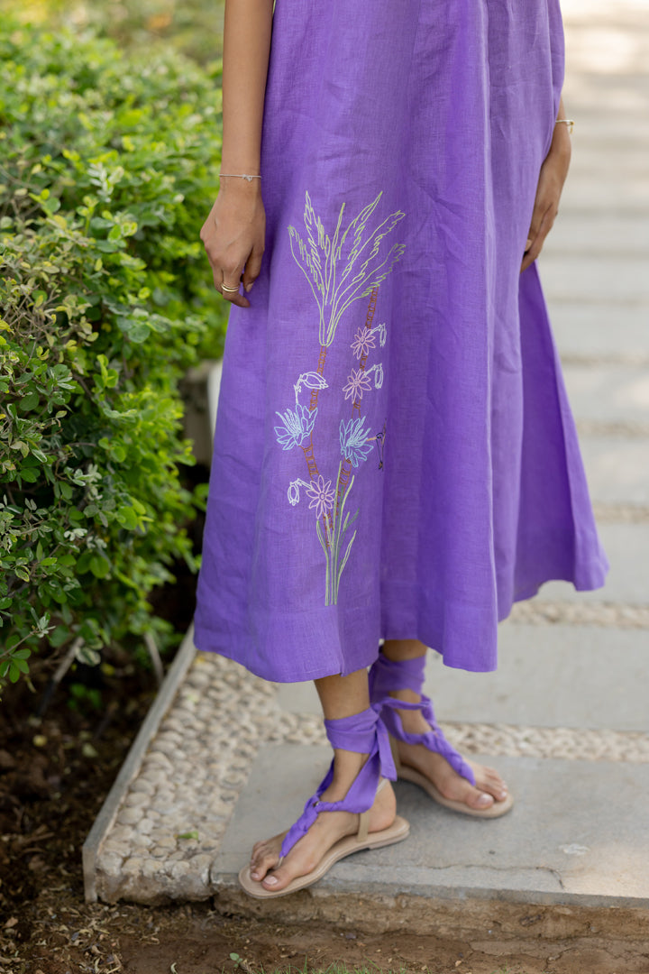 Step into a summer state of mind with this breezy linen V-neck sleeveless dress, inspired by lush tropical escapes. Delicately embroidered with leafy vines and floral patterns, this dress brings nature’s elegance to every step.