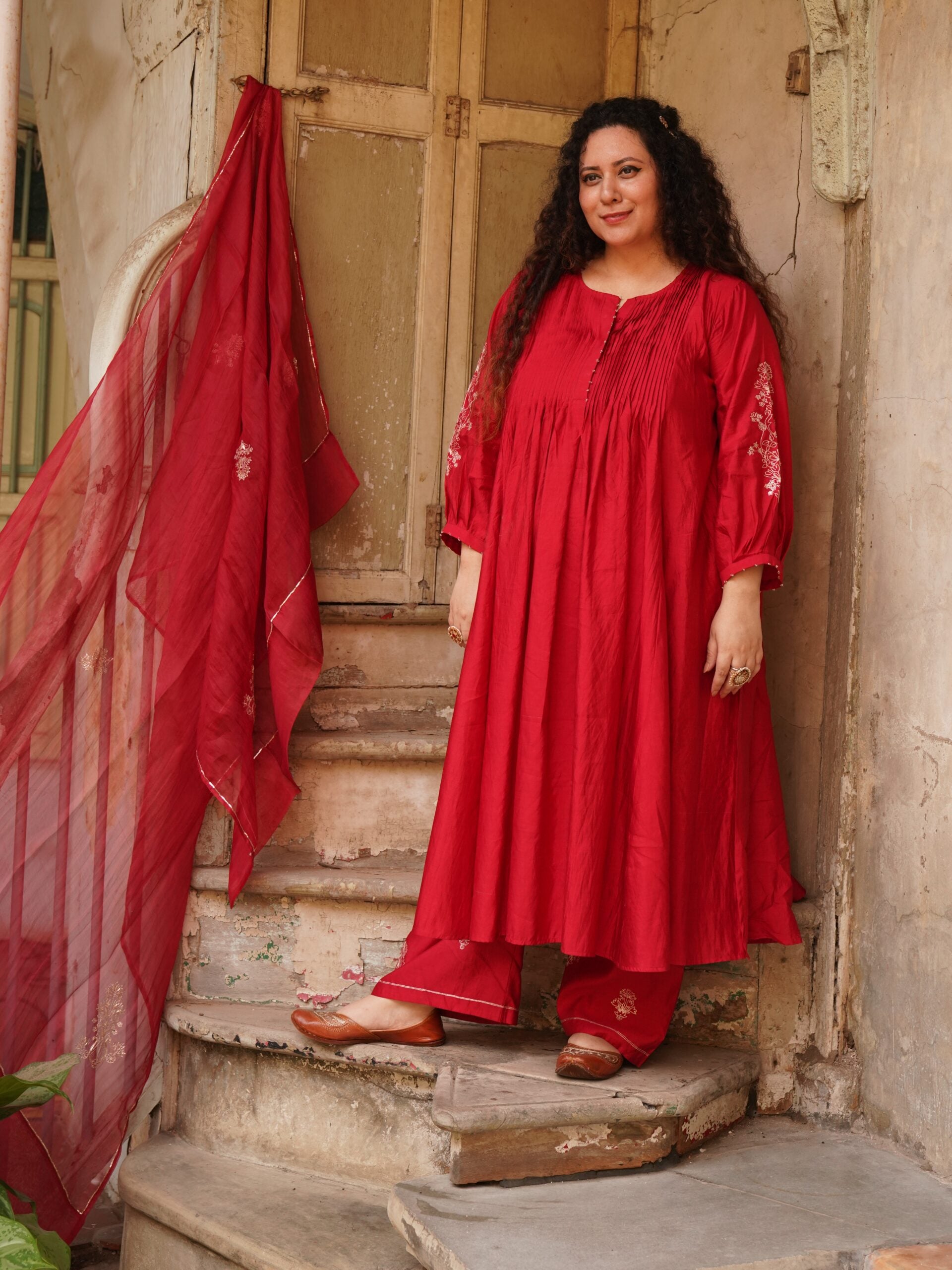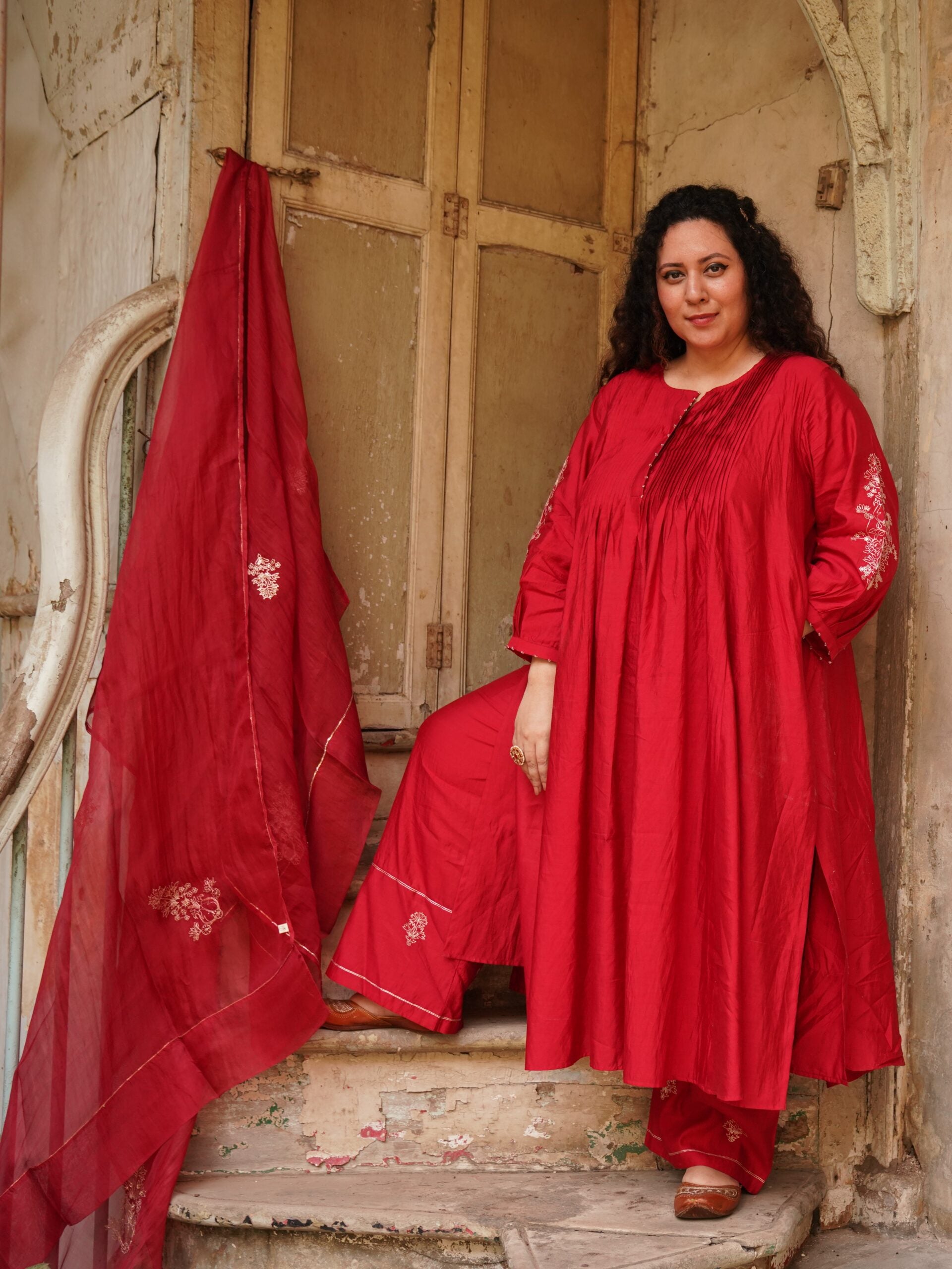 The Sindoori Lal Silk Set is a radiant blend of tradition and elegance. Crafted in rich silk, the ensemble features a flowing kurta with delicate pleats and embroidered sleeve details, paired with coordinated bottoms and a sheer dupatta. The vibrant sindoori red hue embodies festivity and celebration, while the fluid drape ensures effortless grace and comfort.